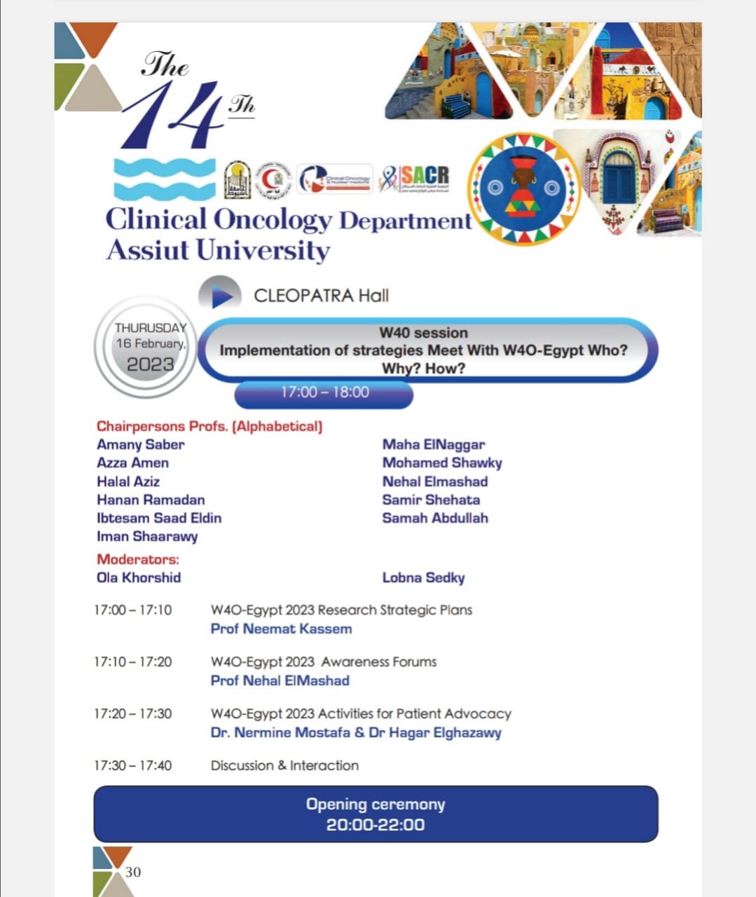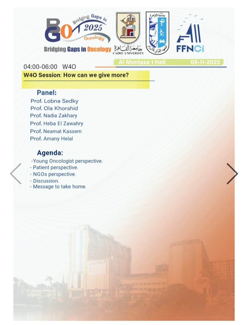 W4O-Egypt: Wednesday November 5, 2025 , El Montaza hall. Intercontinental City Star Hotel As session of the annual conference of NCI, Cairo University. 5-7 Nov 2025